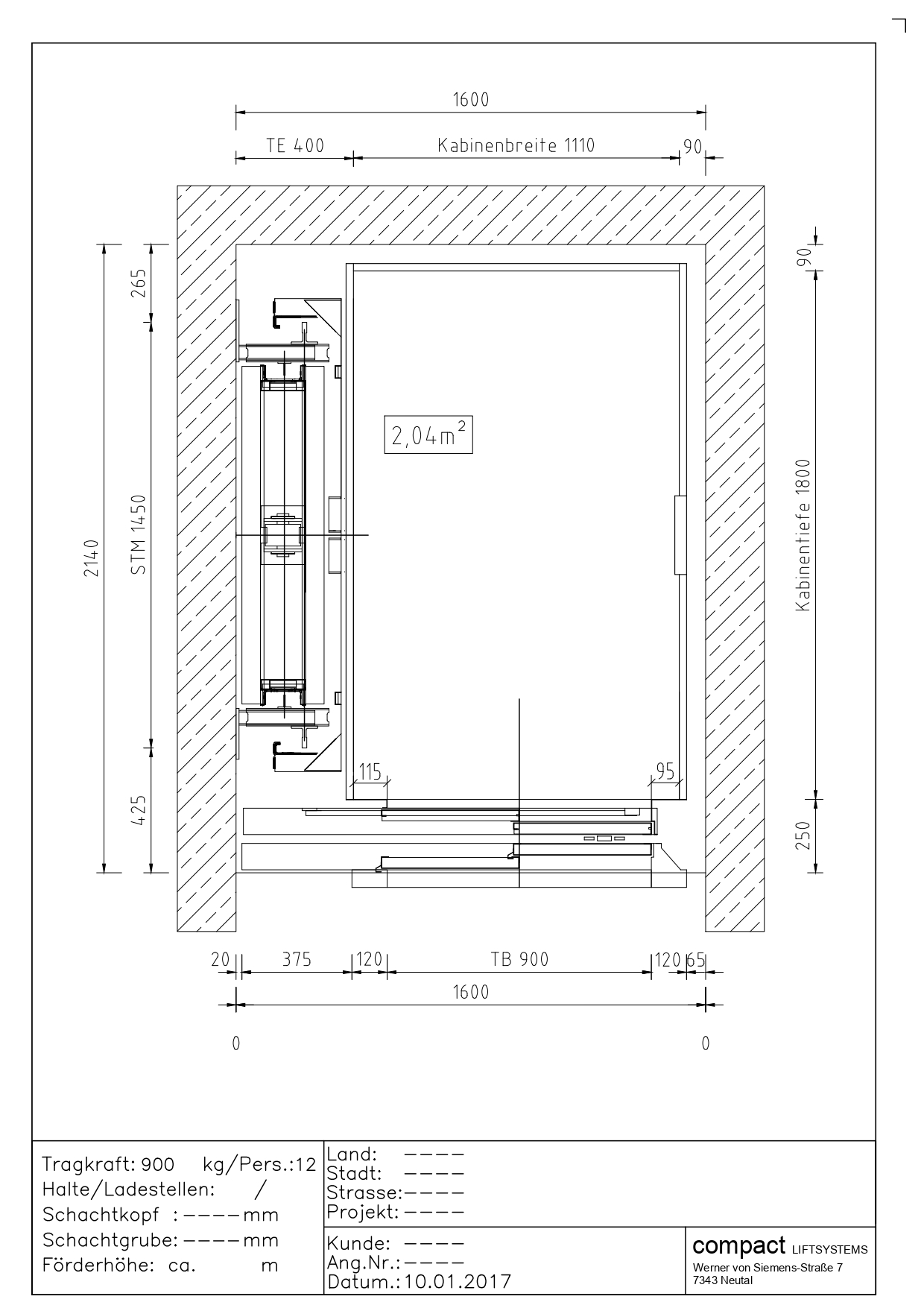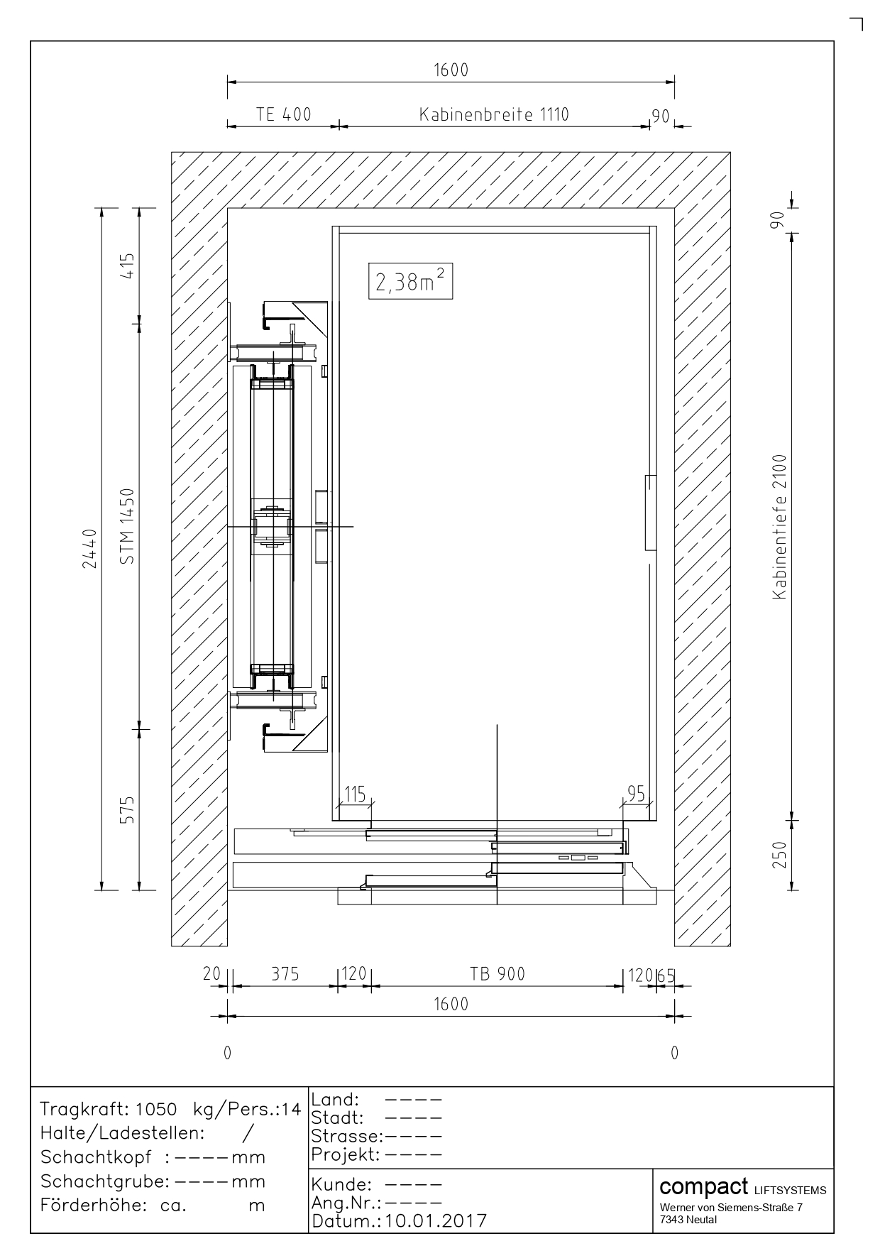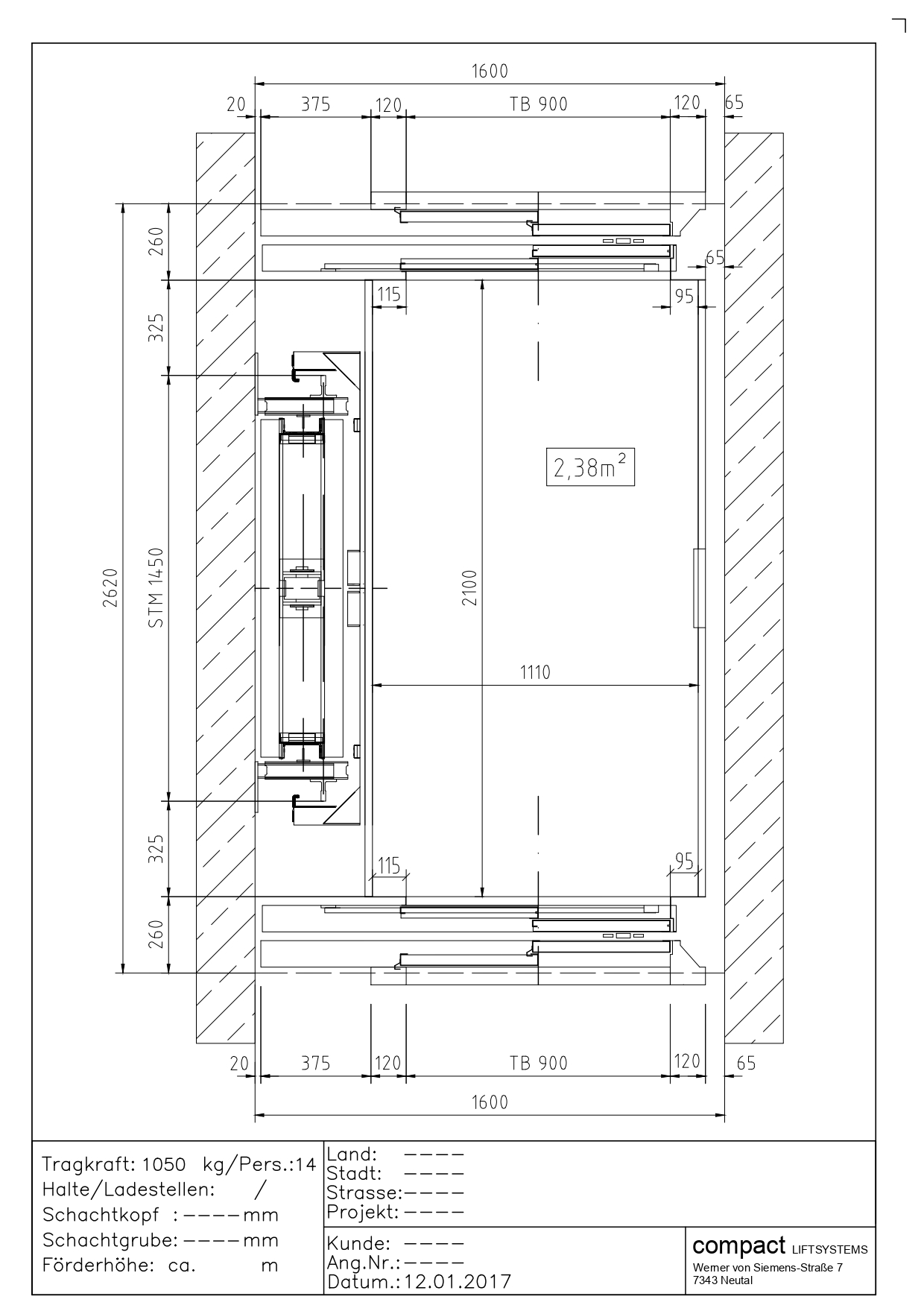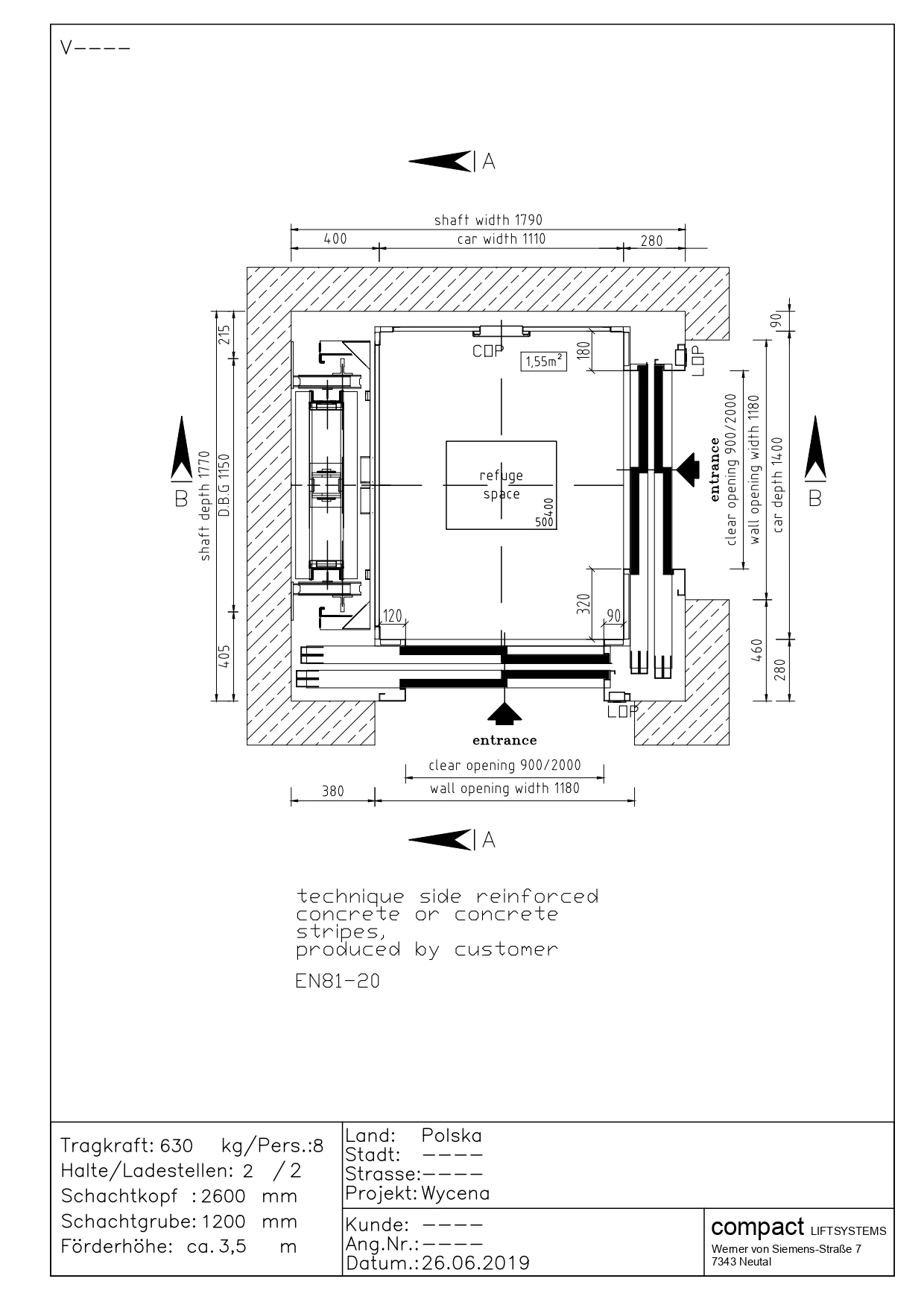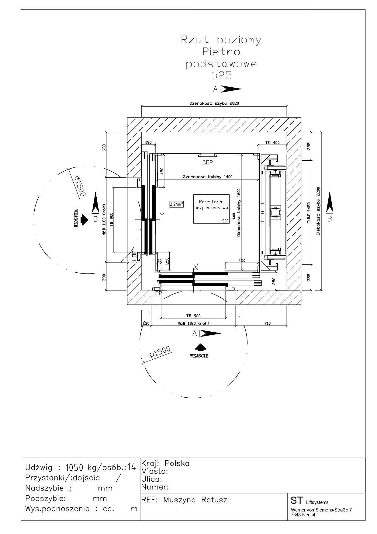 Przekrój windy 1050kg (14 osób)