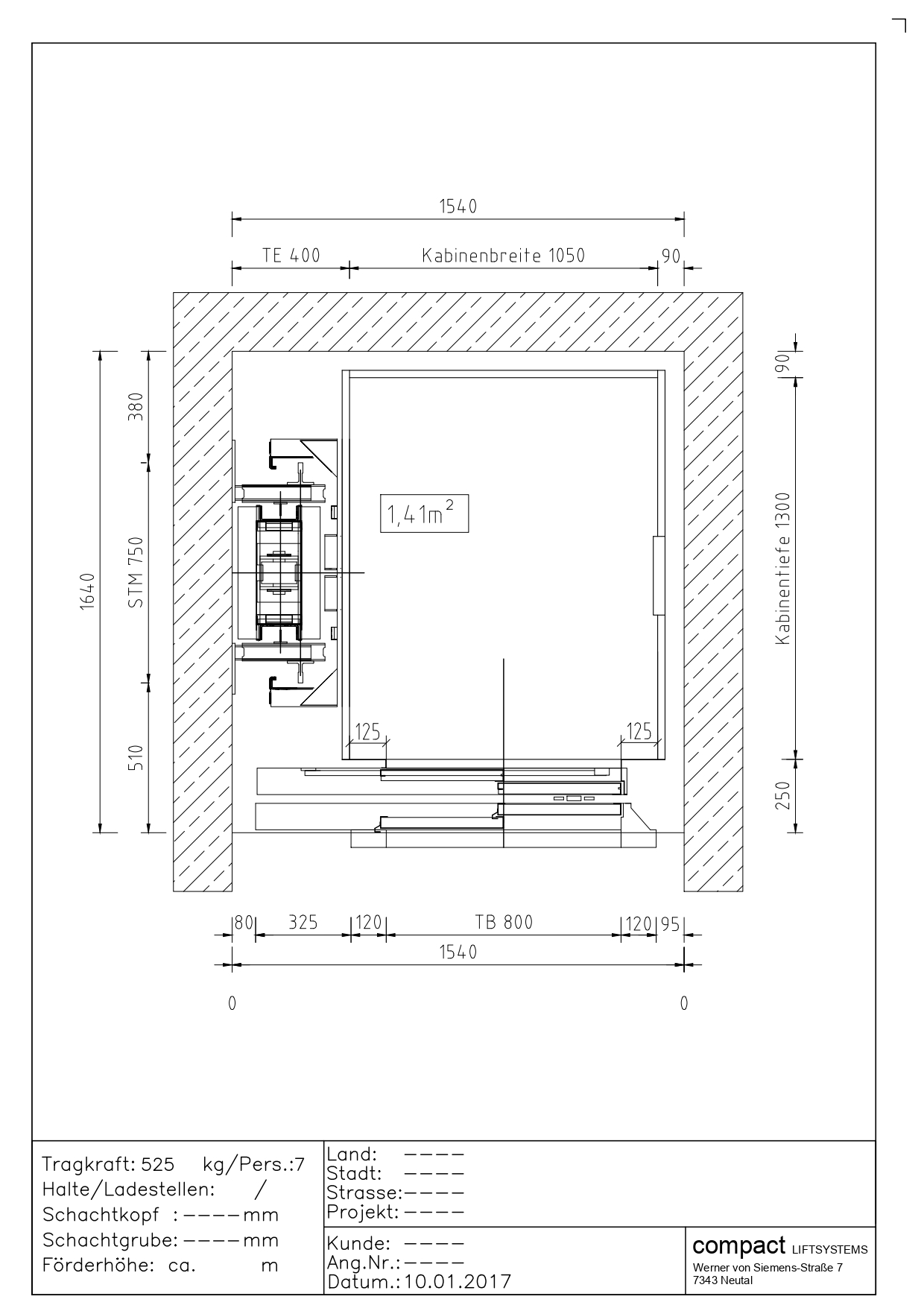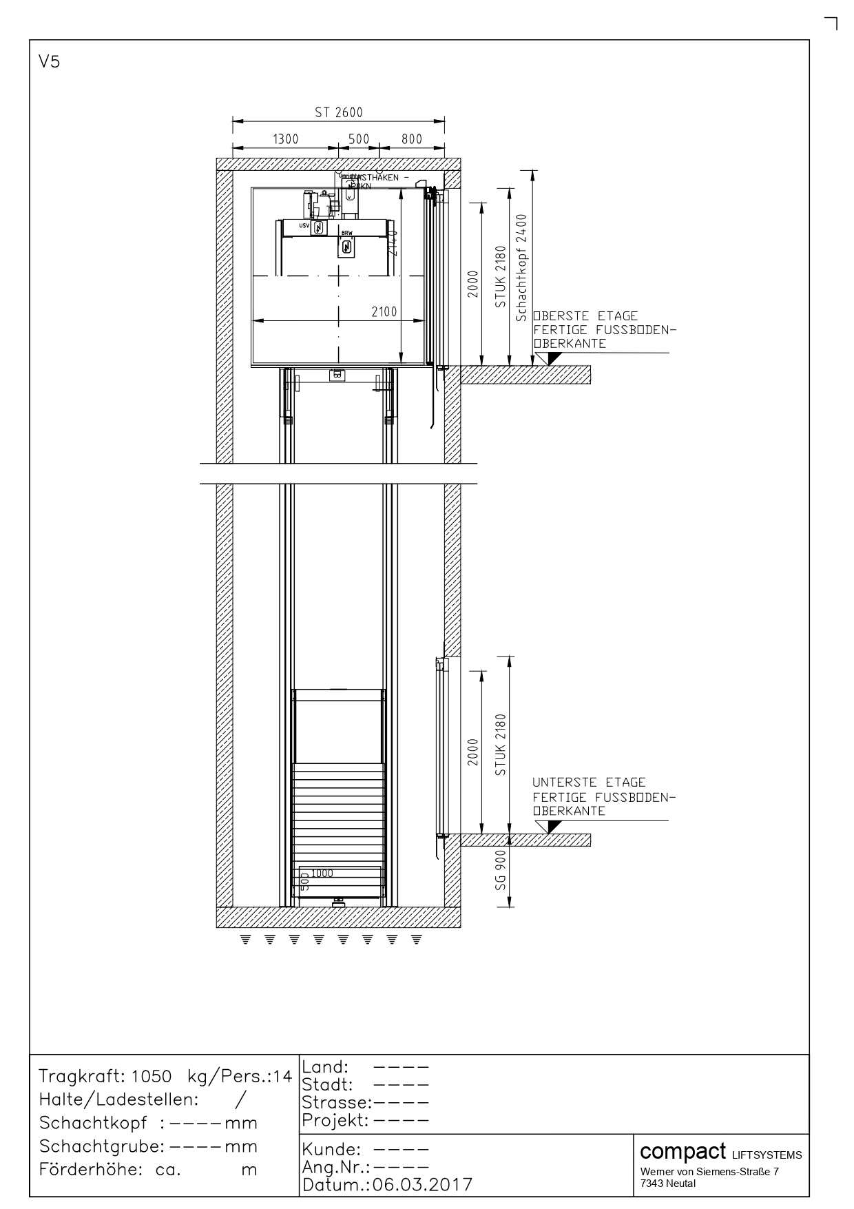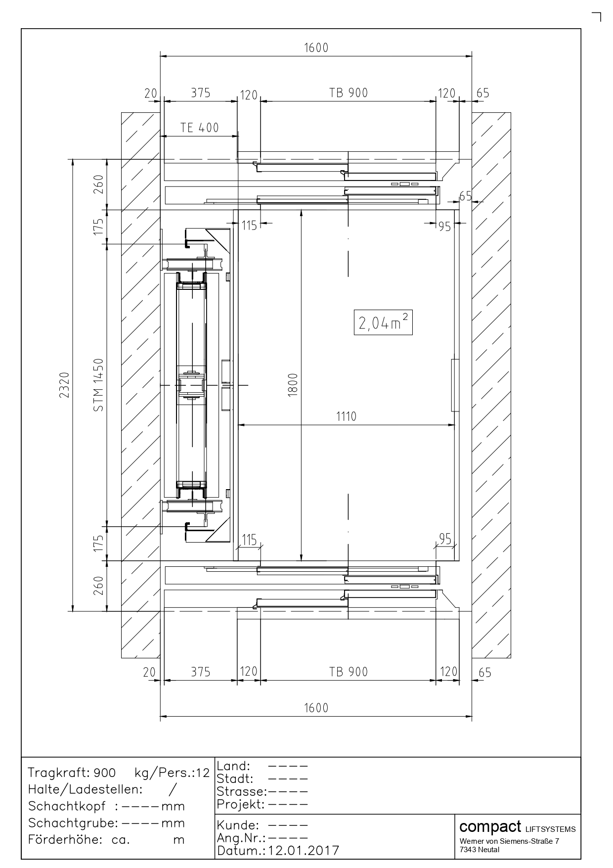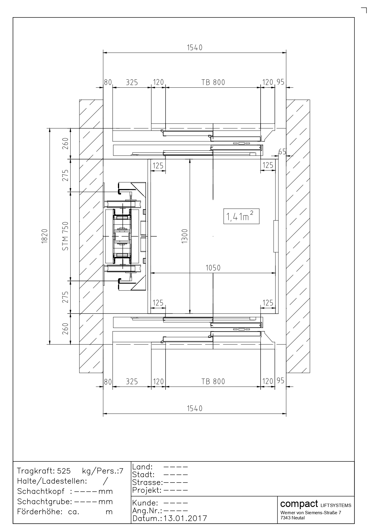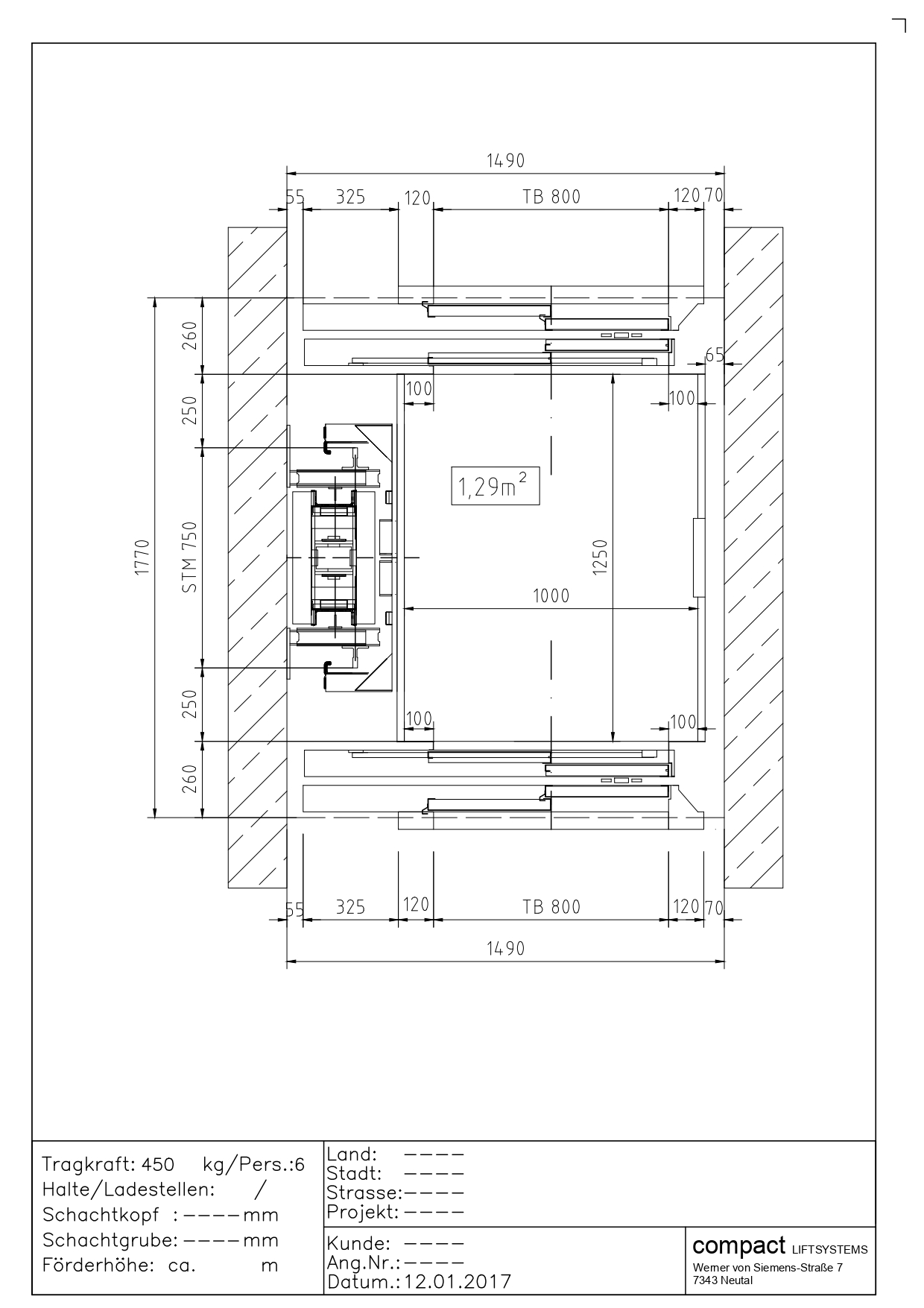 Przekrój windy 1050kg (14 osób)