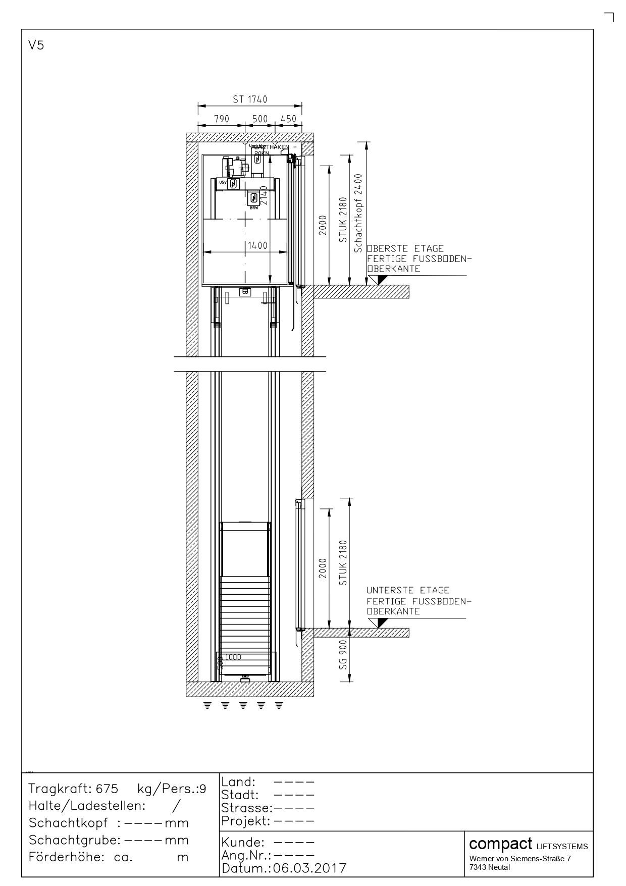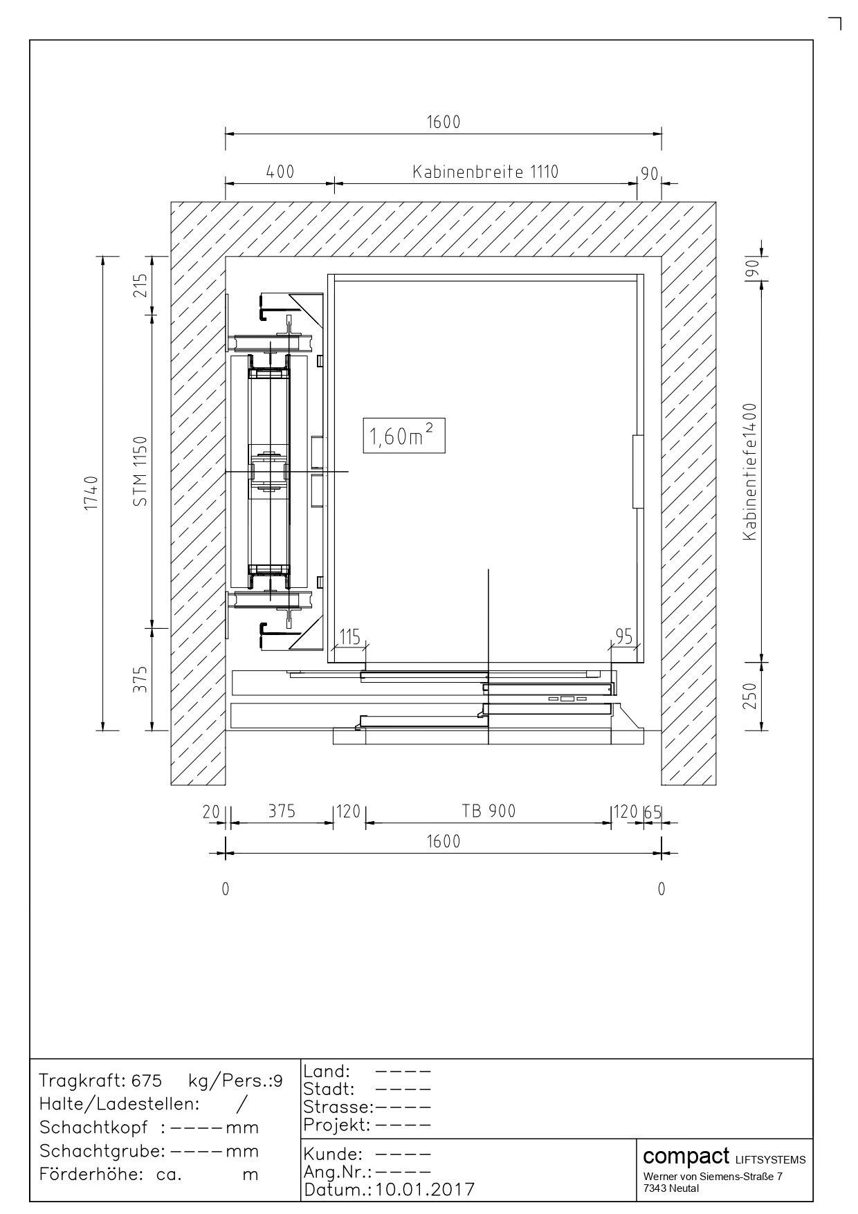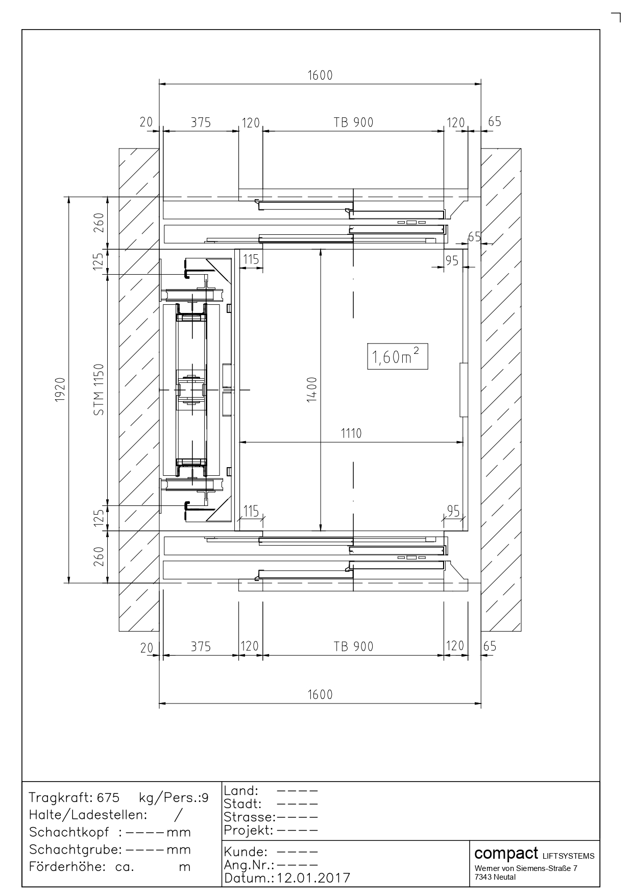 Przekrój windy 675kg (9 osób)